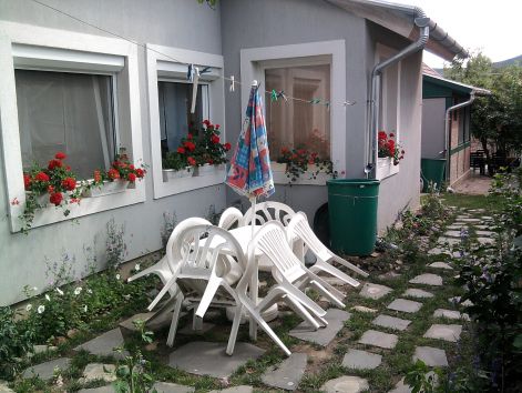 Növényekkel szegélyezett kis járdán jutunk be a vendégházba: